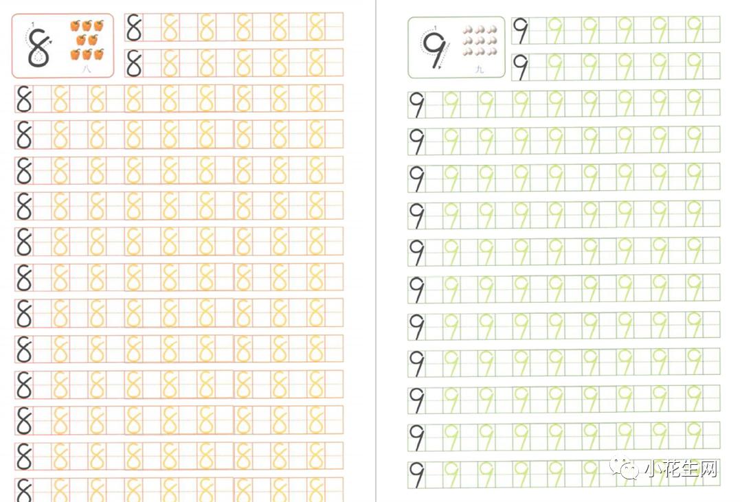 我们家练习书写的路径就是,隔空写,水画布写,自由写画,在笔画形状基本正确后,开始练习描红。从当时笔画不太正确的 8 和 9 开始写(当时8就是画俩圈,9就画个气球),神奇的是娃描红两行后突然就会了(我们就自己打印的描红纸),自己也兴奋不已,此后就每隔几天,练几行。