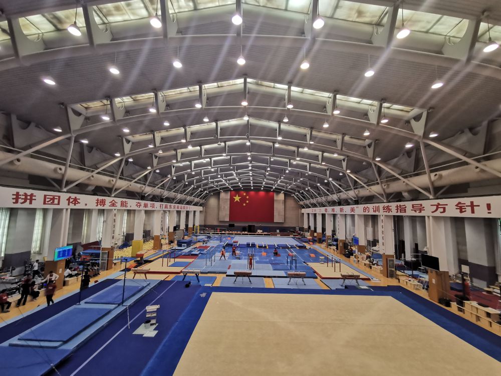 在体操馆的南墙,有一条醒目的标语:拼团体、搏全能、夺单项,打赢东京奥运会翻身仗!