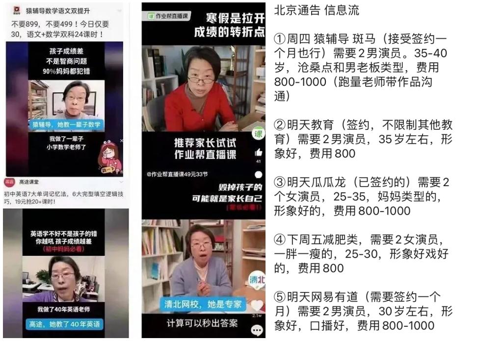 在1月份,同一位“老师”变换着不同的身份,为猿辅导、作业帮、高途课堂、清北网校四家在线教育企业的数学、英语等不同学科做广告,相关视频在微信朋友圈和社群刷屏时,人们纷纷质疑广告内容真实性。