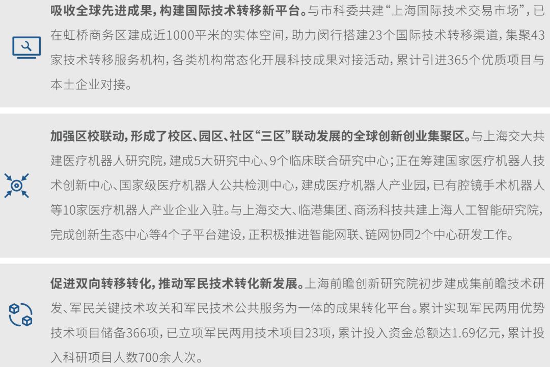 上海市闵行国家科技成果转移转化示范区2018年获批建设,聚焦“国际化网络建设”、“高校策源功能”和“军民技术双向转化”三大特色,建设科创中心成果转化承载区。