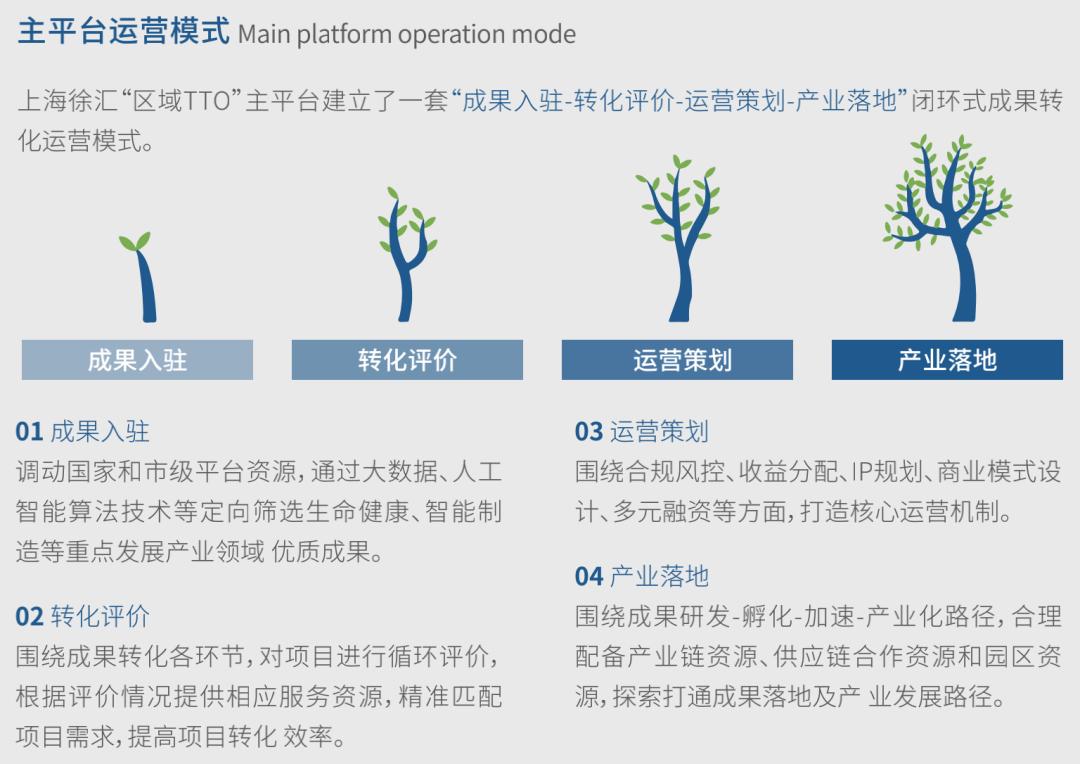 上海徐汇依托区域“大院、大所、大企、大校”的优势资源,按照专业化、市场化、国际化的发展方向,打造体系完善、资源共享、运作舒畅、服务规范、绩效突出的“区域型TTO科技成果转化平台”,构建了“1+N”体系。