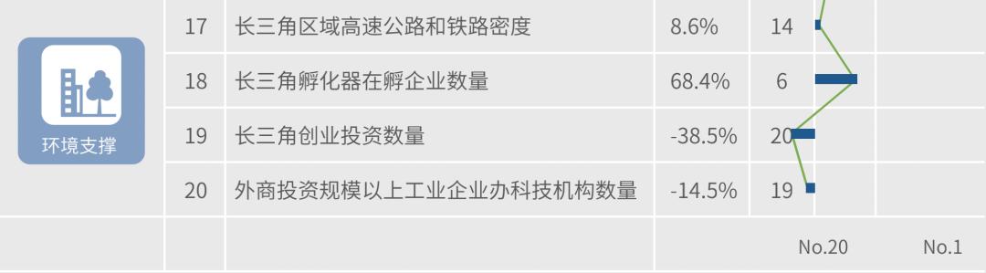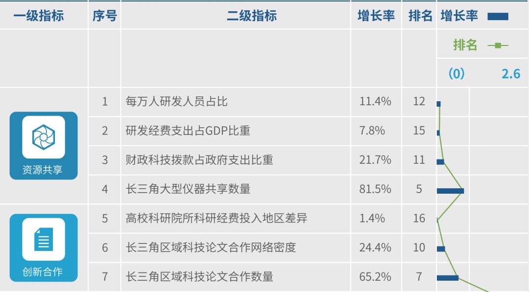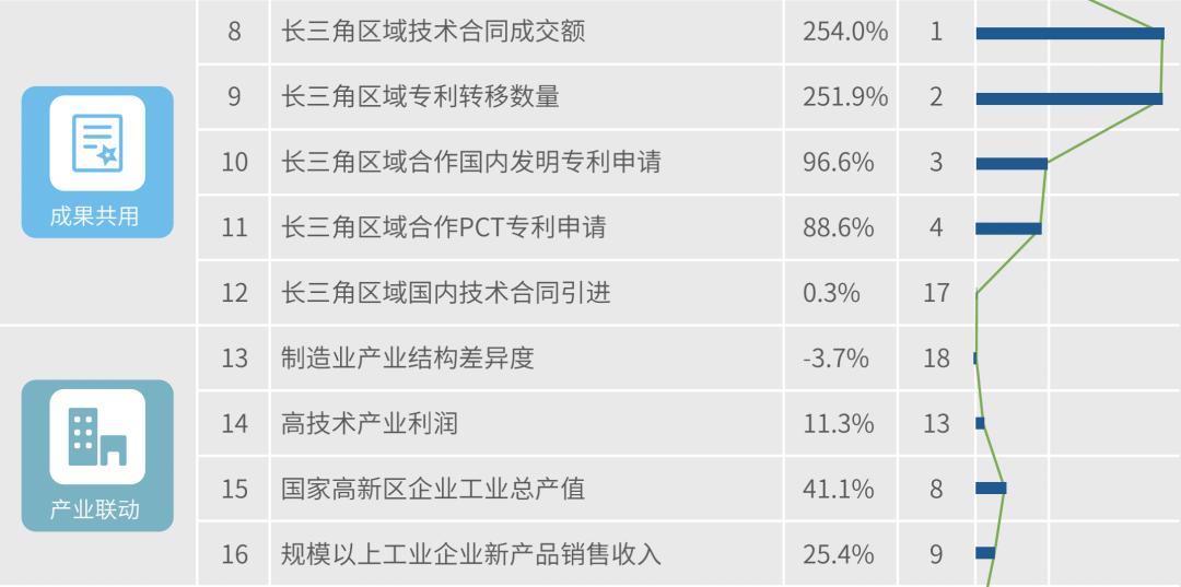 近三年,增长最快的二级指标集中在成果共用,其中长三角区域技术合同成交额、长三角区域专利转移数量、长三角区域合作国内发明专利申请和长三角区域合作PCT专利申请四个指标增长最快。