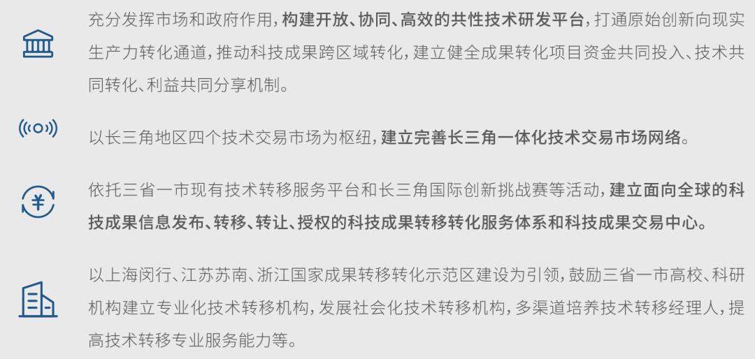 2020年12月,科技部印发《长三角科技创新共同体发展规划》。规划提出“构建一体化科技成果转移转化体系”。主要包括: