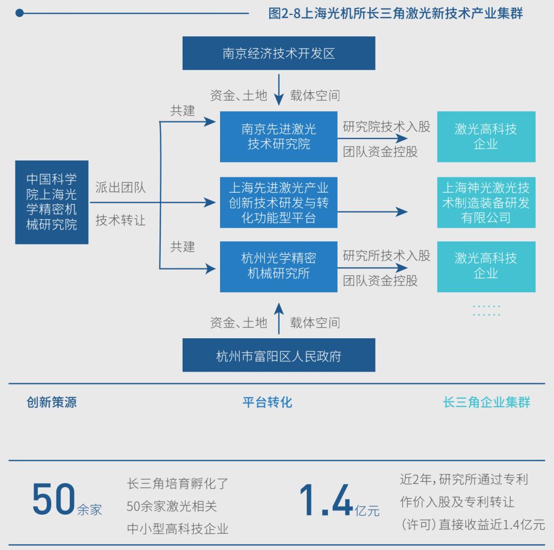 2013年起,上海光机所先后与江苏省南京经济技术开发区管委会共建了南京先进激光技术研究院,与浙江省杭州市富阳区人民政府共建了杭州光学精密机械研究所,与上海激光所、上海集成电路研发中心和上海嘉定工业区集团公司等合作单位共建了上海先进激光产业创新技术研发与转化功能型平台,形成以上海光机所作为科技创新源头,以三个共建研究机构作为成果中试孵化平台,以组建公司实现产业落地的成果转化与孵化模式,加速打造长三角先进激光新技术产业集群。