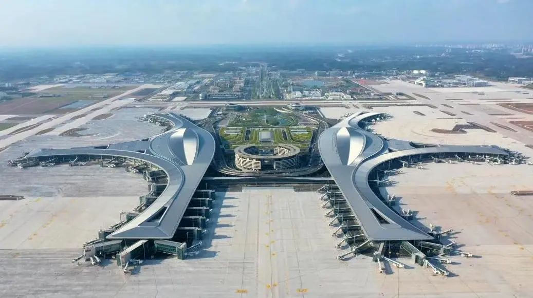 天府国际机场天府国际机场位于简阳芦葭镇,是我国“十三五”期间规划建设的最大民用运输机场,本期建设“两纵一横”3条跑道、71万平方米的航站楼以及相应的配套设施,同步建设空管工程、供油工程、航空公司基地以及邮件处理中心,满足年旅客吞吐量6000万人次、货邮吞吐量130万吨的需求。远期规划建设“四纵两横”6条跑道,140万平方米的航站楼,满足年旅客吞吐量1.2亿人次、货邮吞吐量280万吨的需求。T1、T2航站楼总建筑面积71万平方米,为国内首创“手拉手”结构造型。在满足旅客吞吐量的前提下,这样的设计,可减少旅客从安检到登机口的直线距离。这也使得天府国际机场成为全国首个一次性建设两座航站楼。