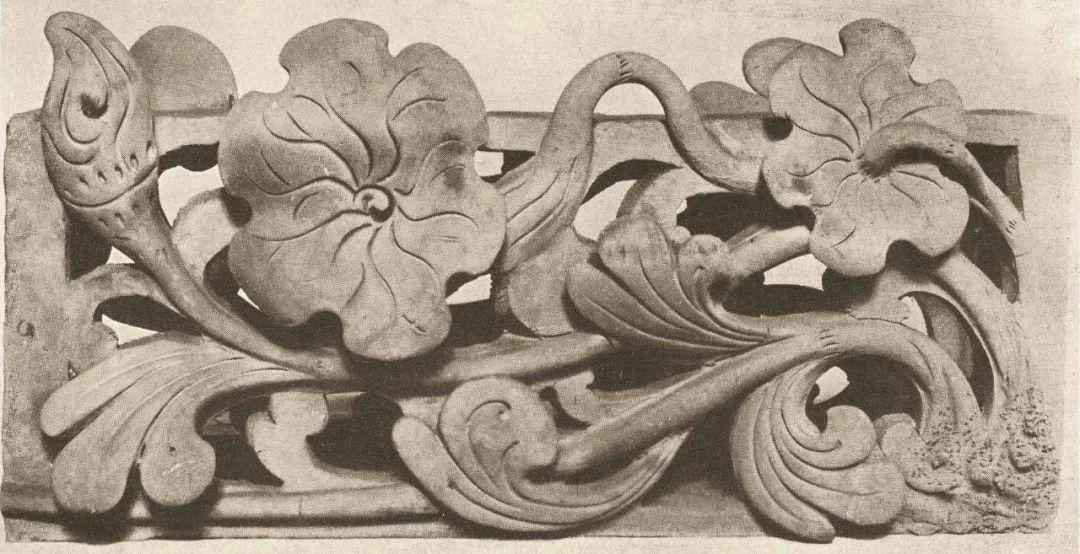 陕西西安府作为屋顶饰物的雕花饰图151中雕纹陶瓦制成的屋面装饰构件,由陕西西安府西北部一家砖窑于1908年制成。它和图42—45一样,现在都藏于西普鲁士马林贝格陶塑收藏馆。这些例子都证明中国陶艺工匠熟练的手工技艺和艺术精神至今仍然活跃。藤蔓曲折流畅的线条、工匠对花朵造型的理解及表现,都非常出色。