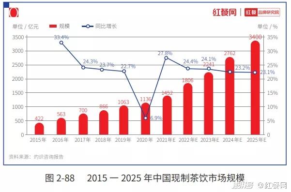 看上去,这样的发展速度、规模,茶饮市场很快就会走出红利期。但世界中餐业联合会和红餐网联合出版的《中国餐饮品类和品牌发展报告2021》数据显示,2020年现制茶饮市场规模1136 亿元,预计到 2025年将达到3400亿元,年复合增长率为24.5%。