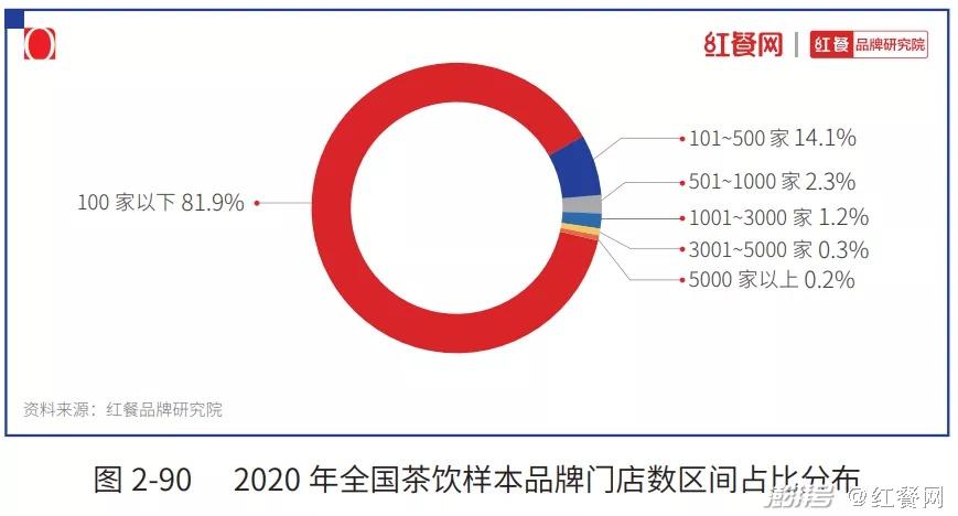 同时,根据《中国餐饮品类和品牌发展报告2021》数据,2020年茶饮品牌门店总数在100家以下的占到81.9%。可见在现制茶饮行业中,大部分茶饮品牌门店数量偏少,整体规模也普遍偏小,竞争力尚不强,也给了很多新进入的茶饮品牌以机会。