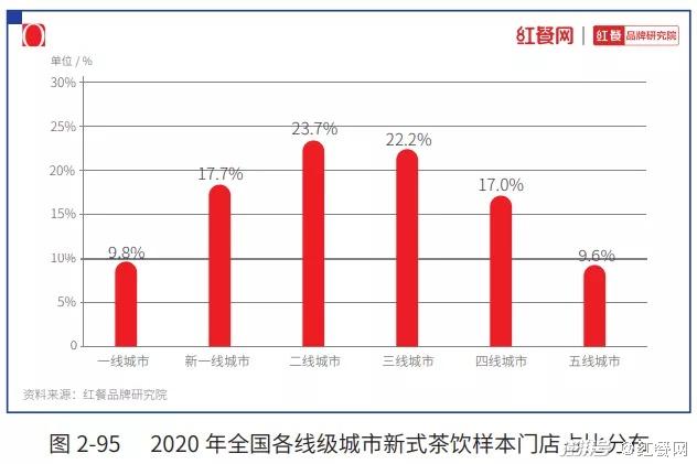 《中国餐饮品类和品牌发展报告2021》数据显示,在全国茶饮门店数统计中,二线、三线城市的茶饮门店数占比最高,分别达到了 23.7%、22.2%,超越了一线、新一线的占比,二线及以下城市的门店数总占比超过了 70%。