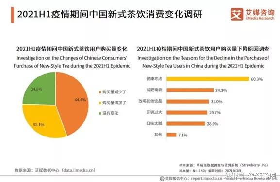 现在的消费者,越来越看重健康,特别是疫情之后。艾媒咨询相关调研显示,2021年一季度新茶饮用户购买量下降的原因中,健康考虑和减肥占据前两名,分别为60.3%和34.3%。