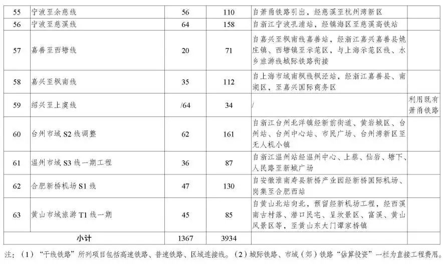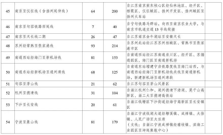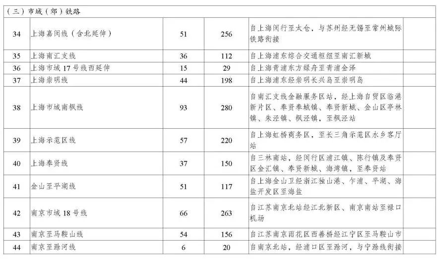 有序推进新线建设。支持重点都市圈规划建设市域(郊)铁路,鼓励市域(郊)铁路与干线铁路、城际铁路、城市轨道交通多线多点换乘,推动具备条件的跨线直通运行。市域(郊)铁路可向具有同城化趋势、通勤需求较高的毗邻城市(镇)适当延伸覆盖。规划建设上海嘉闵线(含北延伸)、上海南汇支线、上海南枫线、金山至平湖、南京市域 18 号线、南京至马鞍山、句容至茅山、杭州至德清、杭州下沙至长安、宁波至象山、温州市域 S3 线一期、台州市域 S2 线调整、合肥新桥机场 S1 线、黄山市域旅游 T1 线一期等项目。支持杭州至海宁铁路延伸至文正街站。远期布局沪崇启、南京至和县二期、南京经乌衣至滁州、扬州经扬泰机场至泰州、徐州至萧县、徐州至贾汪、杭州至诸暨、绍兴至嵊州至新昌、金华至武义至永康至东阳、台州市域 S3 线、湖州至安吉、合肥至巢湖、合肥至庐江、黄山市域旅游 T2 线一期、马鞍山至郑蒲港等项目。