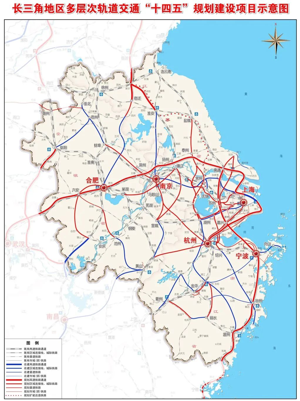 以推进互联通达为重点,优化城际铁路规划布局,充分挖潜既有干线铁路城际功能,加快建设沪宁合、沪杭、宁杭、合杭甬等轴带城际铁路及区域连接线,构建轴带通达、节点辐射的城际铁路网络,强化上海、南京、杭州、合肥、宁波等主要节点城市之间及与周边城市的高效联通。