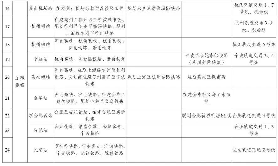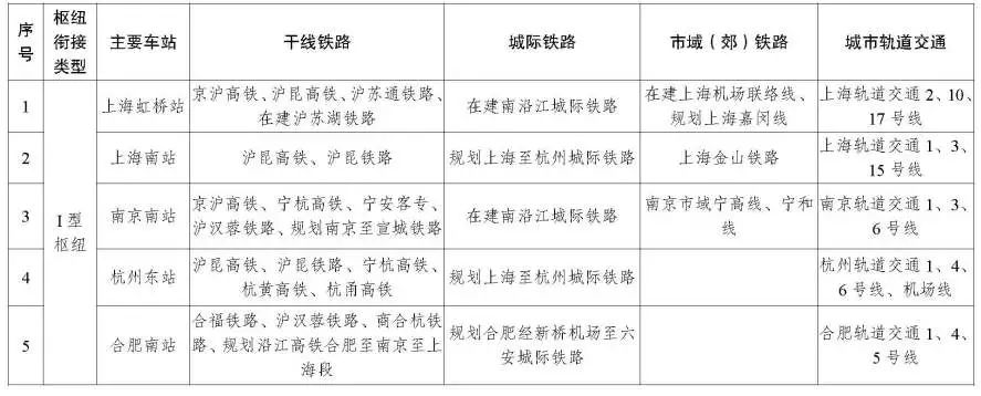 I 型枢纽。以重点大型铁路客站和枢纽机场等城市内外交通汇聚集散的场站为载体,推动干线铁路、城际铁路、市域(郊)铁路、城市轨道交通至少“三网”及多条骨干轨道交通线路高效衔接、便捷换乘,力促枢纽内任意方式间换乘最长行走时间不超过 5 分钟。总结借鉴上海虹桥枢纽经验,打造上海南站、南京南站、杭州东站、合肥南站等枢纽,推进新建枢纽内各种轨道交通统筹布局、协同建设、同步投产、一体服务,近期不具备同步实施条件的应做好规划或工程预留。