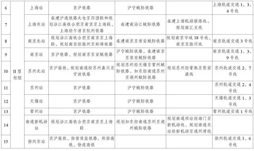 II 型枢纽。依托铁路主客站或城际客站等,紧密衔接干线铁路、城际铁路、市域(郊)铁路、城市轨道交通中的“三网”或多条骨干轨道交通线路,力促枢纽内任意方式间换乘最长行走时间不超过 3 分钟。加快建设上海东站、南京北站、杭州西站、新合肥西站、苏州北站、嘉兴南站等枢纽,并为枢纽发展预留空间。优化枢纽内部功能布局和交通流线,有序推进衔接通道换乘改造为立体换乘,积极推动具备条件的轨道交通方式间同站台换乘。