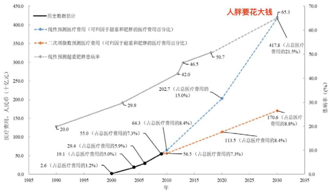 目前的数据已经令人担忧,而直至2030年的预测数据更是触目惊心[3]。预计到2030年,中国成年人、儿童和青少年和6岁以下儿童中分别会有近7.9亿、5892万和1819万人超重或肥胖。2030年与超重肥胖相关的医疗费用可达到4180亿人民币,约占全国医疗费用总额的22%,相当于办40次预算15.6亿美元的2022年北京冬奥会。