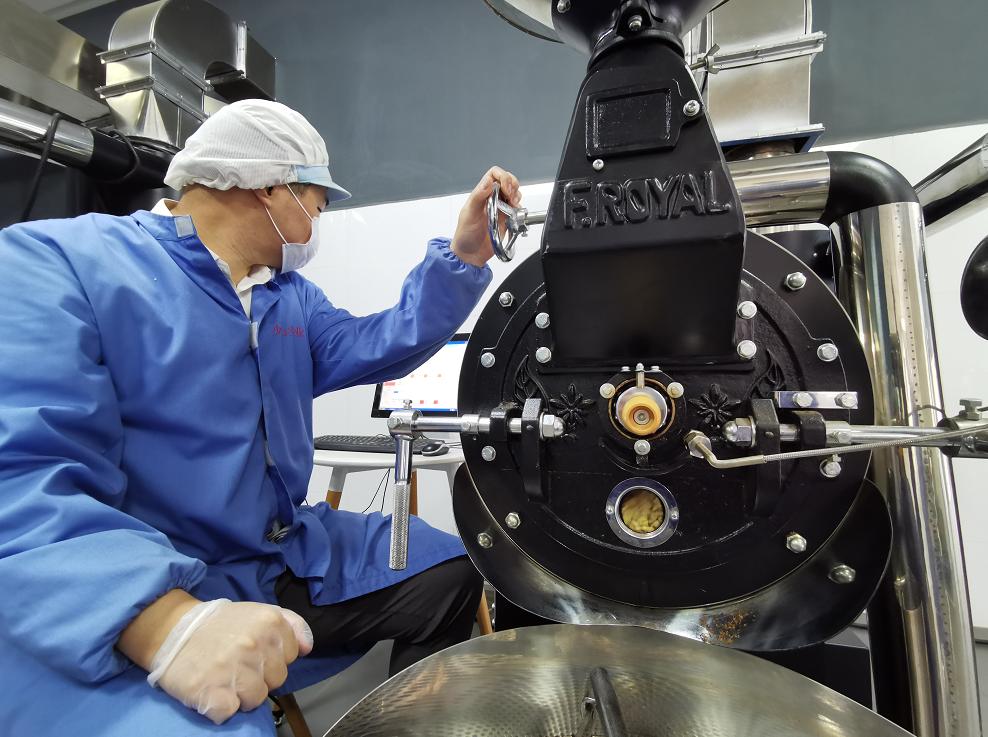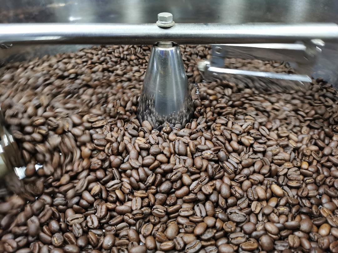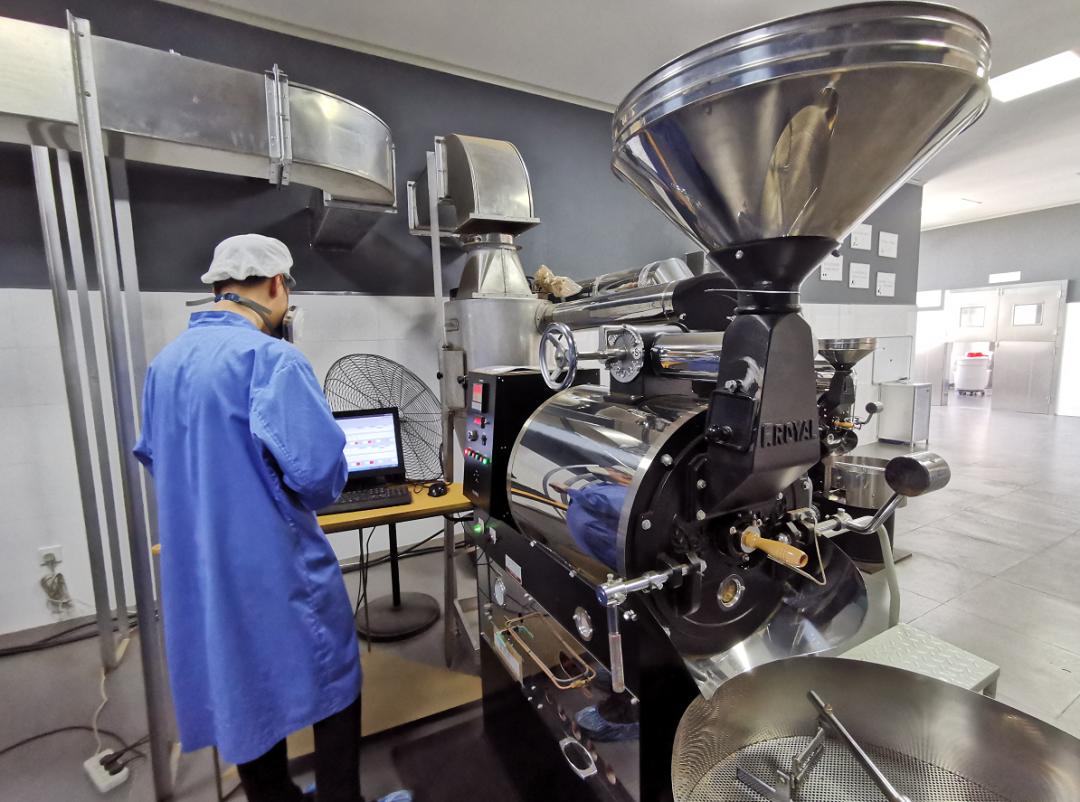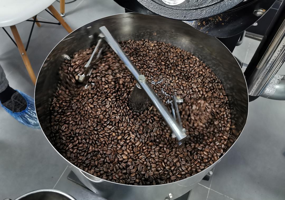 进入生产车间,要换上工作服,戴上防护帽和脚套,经过严格的清洁消毒程序。进入工作区,小编看到三台大型烘焙机正在进行烘焙作业,泛着青绿色的生豆在机器里被不停搅拌、加热,发生一系列物理和化学反应。十几分钟后,咖啡豆颜色逐渐变深,最终成了深褐色,并散发出浓郁的咖啡香气。