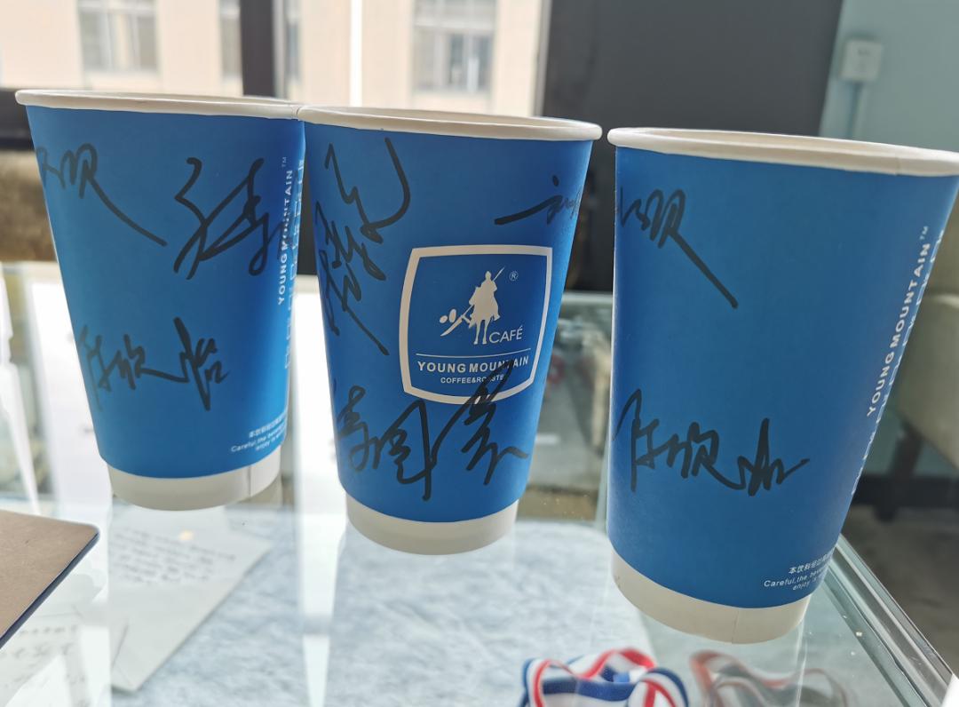 工厂陈列区陈列的中国女子游泳队傅园慧等人签名的咖啡杯