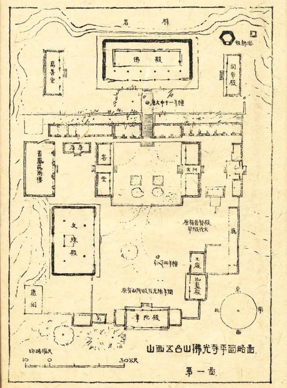 现状 佛光寺在南台豆村镇东北约五公里之佛光山中。伽蓝依岩布置,(第一图),正殿踞于高台之上,俯临庭院,东南北三面峰峦环抱,唯西向朗阔,故寺门正殿均西向。寺门内庭院广阔,大部荒顿,左右两侧,南向者为文殊殿五间,结构奇绝,细查各项手法,则属北宋形制。(详下期本刊)。北向者旧有普贤殿对峙,寺僧已不忆毁于何时,今殿址仅立厩舍数楹而已。山门卑小,称韦陀殿,为近世草率重修。旧有山门相传焚于清光绪间。文殊普贤两殿间庭院中,残砖茂草,经幢屹立,唐乾符四年物也。(第廿一图)。两殿之东至正殿台下距离颇远,各为四合小院。小院东房皆为砖砌窑室七券,简陋殊甚,南北为清式小阁殿堂,为今僧舍客堂。