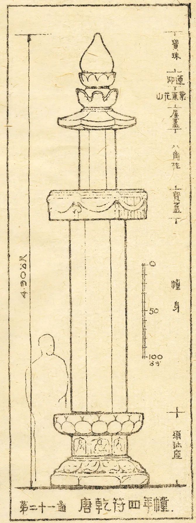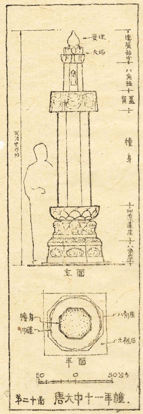 (乙)乾符四年幢(第二十一图) 幢在山门内文殊殿之前,但为其位置不与山门佛殿中线取直而略偏南。亦不与文殊殿中线取直而略偏西。