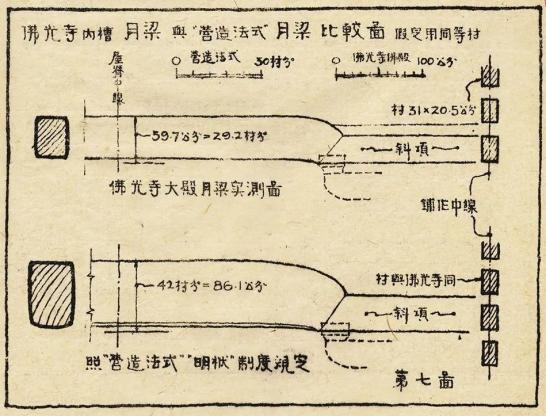 殿所用月梁其权衡及卷杀之法亦与《营造法式》之法异(第七图)。佛殿四椽明栿之广(即高度)为60cm,约合斗栱用材之二十九分°强(见下文斗栱分析),与法式“明栿广四十二分°……四椽栿广五十分°”之规定均相去甚远。因其高度既逊,而同为四椽栿,故唐栿较宋栿为纤瘦。其断面高与宽之比约为5∶7,加以月梁中段下䫜,故其中段断面近乎4:5之比。因斗栱出跳数多,故斜项奇长,而隐出材栔之区别。四椽栿之梁首引伸为槽外乳栿上之平棊枋,而乳栿梁头则引伸为四椽栿下之华栱。梁背两肩之“卷杀”及梁底之“起䫜”“瓣数”及“瓣长”均不清晰,仅能以图解与宋式相较(第七图)。至于内外柱上之乳栿,其高度仅及一足材,呈现极端纤瘦之外表,与宋《法式》所规定之“两材一栔”,相去更远矣。