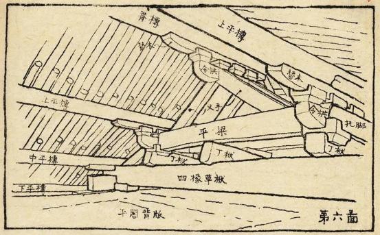自纵断面之结构上观梁架(第二图),最复杂及困难部分乃在梢间上部。盖当心间左右两间柱缝上各施齐整对称之梁架,由明栿至草栿,各缝间施长槫和襻间(即槫下之长枋),尽间结构(即纵断面所见之外槽结构),如横断面之外槽,内外柱间施草栿相联系,至为简易明晰。惟梢间之上(第二第三两缝间)别施丁栿三道。此丁栿背上所负之各部,极为重要,为承托山面与前后两瓦坡相汇处之必须结构,故在解释上稍见复杂(参阅第六图)。