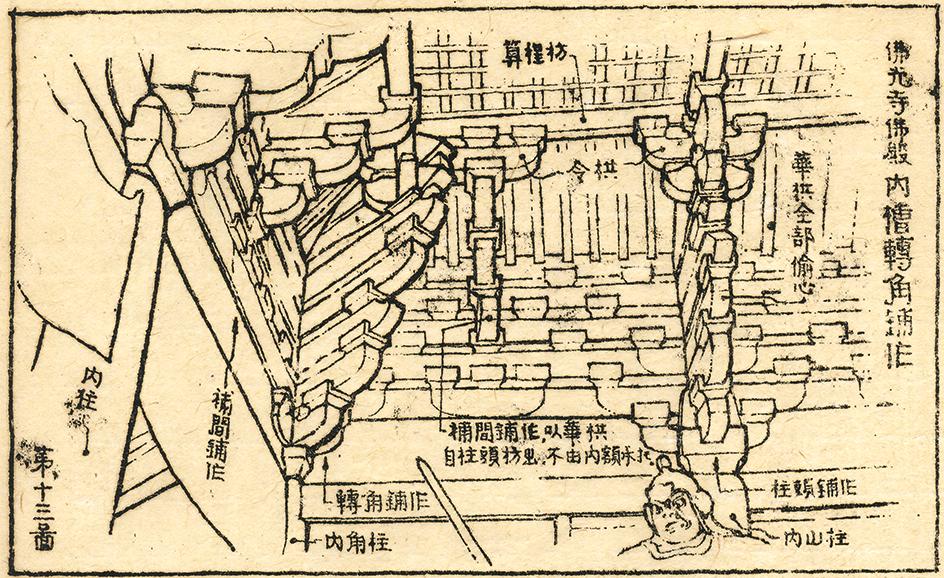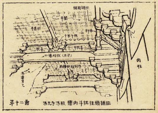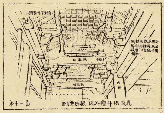 就梁栿与柱之关系论,则有内槽与外槽两组。内槽大梁(“四椽明栿”)为前后内柱间之联络(第十一图)。此种配合,即《营造法式》所谓“八架椽屋前后乳栿用四柱”者也。内柱与外柱同高,其上均施“七铺作”斗栱(即四跳的斗栱)。檐柱上斗栱出四跳,“双抄双下昂”,以承檐槫及檐部全部结构。内柱上斗栱四抄(无下昂),承檐内四椽明栿。此内外斗栱后尾相向,自第二跳后出为“明乳栿”,即内柱与檐柱间之主要联络材也。