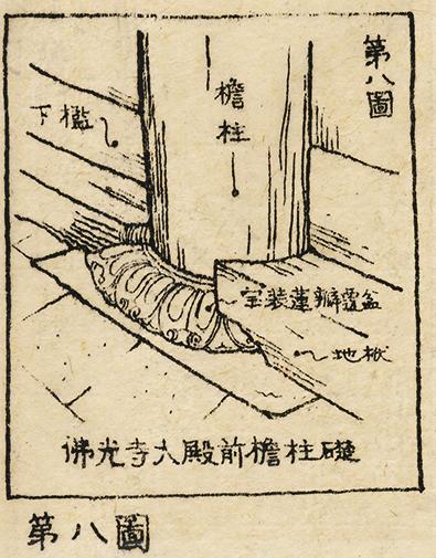 柱础之方微逊于柱径之倍,前檐诸柱均有“覆盆”,饰以宝装莲花(第八图)。覆盆约为础方之十分之一,与《营造法式》规定大致符合。莲瓣宝装之法,每瓣中间起脊,脊两侧突起椭圆形泡,瓣尖卷起作如意头,为唐代最通常之作风。后部内柱,有就地下岩石为础者,盖地本凿崖辟出,其就岩作础亦从权之法,颇为有趣。