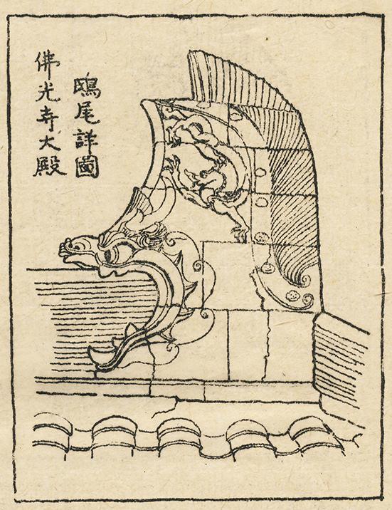 佛殿屋顶覆以瓪瓦。瓦长约50cm,宽约31cm,厚3.5cm,颇为硕大。瓦陇以52或53cm中至中之距离排列。檐头施重唇板瓦,其重层饰花作双行连珠纹,唇外缘作锯齿形。正脊垂脊均用瓪瓦垒叠,其上覆以筒瓦而成。正脊于当沟及线道瓦之上用瓦十九层,垂脊则用瓦九层。正脊两端施庞大鸱尾(第九图),虽尾尖已损坏,尚高达3.07公尺。鸱尾轮廓颇为简洁,自龙鼻额以上,紧张陡起,迥异于清代作风,其背侧线则垂直上升,然后向内弯曲,颇似山西大同华严寺及河北蓟县独乐寺山门辽代遗例。鸱尾隐起花纹,除龙嘴眼角及尾上小龙外,其尾鳍及嘴翅隐起均微,呈现极秀致之现象。但就琉璃质泽观之,似为明代物。正脊正中施火珠,连座通高2.66公尺,珠下座多层,颇为繁缛,恐属清代所造。