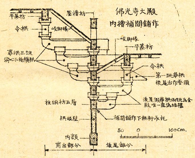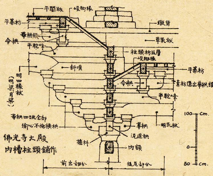 至于斗栱全部之高,适合檐柱高之半,故所呈外表,至为雄大豪壮。盖古之斗栱本为结构中主要部分,至元明以后乃日渐纤小而沦为装饰部分焉。但如殿槽内补间铺作后尾之假作两华栱以求外形之对称者,实结构上之欺诈行为,又不禁为当时匠师惋惜也。