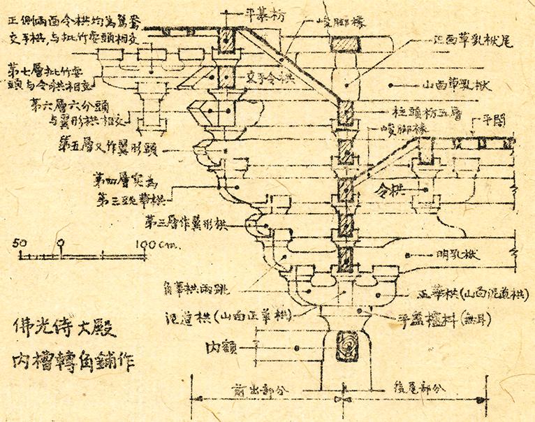 施于外檐柱头上之斗栱,七铺作双抄双下昂。自栌斗出华栱两跳,第一跳“偷心”无横出之栱;第二跳跳头施瓜子栱,慢栱,以承罗汉枋。第三第四跳为下昂,第三跳偷心,第四跳跳头施令栱,与翼形耍头相交,令栱上施替木,以承橑檐槫。后尾(第十一图)第一跳出华栱,第二跳为乳栿(与外出第二跳华栱相连做)。第三跳用一材,其外端至第二跳头交互斗内止,以承第一层下昂。其内端杀作半驼峰形,上施交互斗,其上令栱与隐出华栱十字形相交,以承平棊枋(亦称算桯枋)。第四跳(或第四层)实际上为一枋,其表面隐出华栱,栱头上施斗,以承其上之平棊枋。下昂两层后尾,以约略23°之斜度向上挑起,后端压于草乳栿之下。与华栱下昂在柱中线上相交者,最下层为泥道栱,与第一跳华栱在栌斗内相交。泥道栱以上,计施柱头枋四层,第一层隐出慢栱,与第二层华栱相交,以上两层又各隐出令栱(或泥道栱)及慢栱。更上施压槽枋一层,与草乳栿相交。于第二跳华栱中线上,即《营造法式》用牛脊槫之分位,别施一枋(或可呼为牛脊枋),均直接承托椽下。