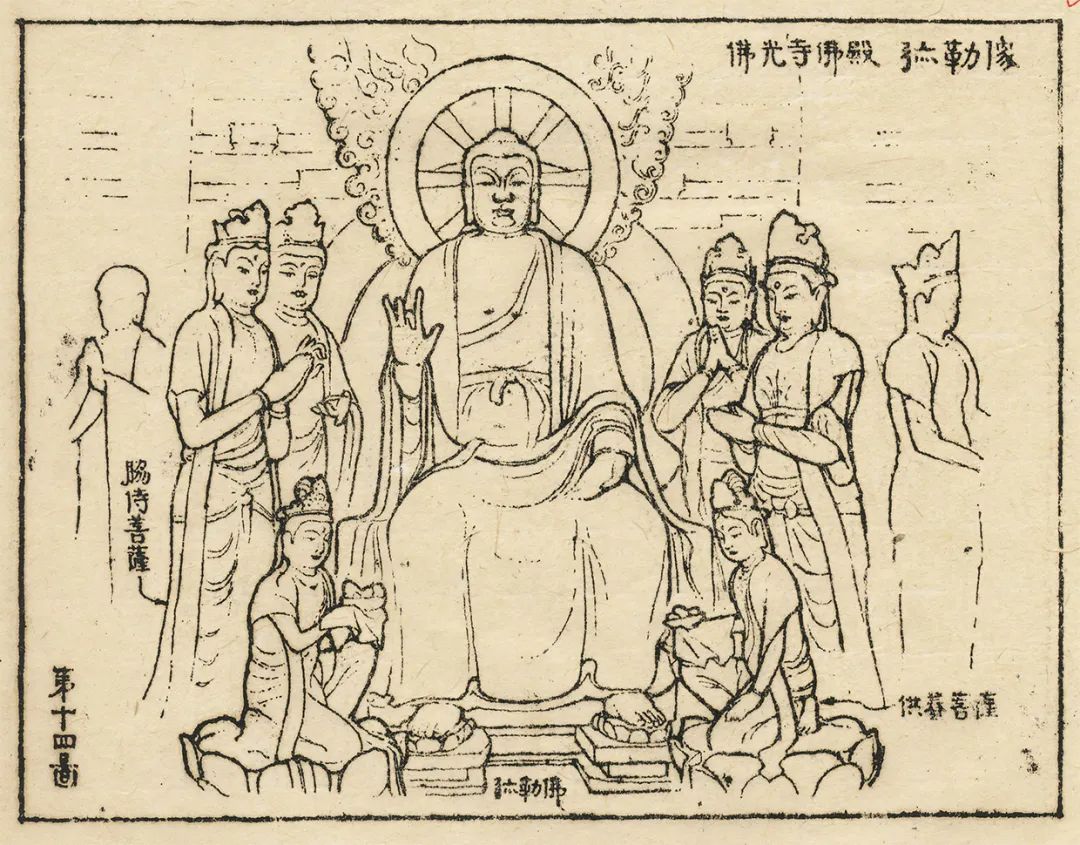 (甲)中三间之主像及胁侍等 佛殿槽内五间之广,一间半之深,为高74 cm之大佛坛。坛上主像五尊,各附胁侍像五六尊不等。当心间主像为降魔释迦,袒右肩右手垂置右膝作“触地印”,左手捧钵腹前,趺坐长方须弥座上。左次间主像为弥勒佛,垂双足坐,左右足下各有莲花一朵。双膝并垂,为唐代最盛行之姿势,而宋后所罕见者(第十四图),故最堪注意。右次间主像为阿弥陀佛,双手略如“安慰印”状,趺坐六角须弥座上,衣摺自座下垂。释迦左右迦叶阿难两尊者并两菩萨侍立,更前则两供养菩萨跪莲花上,手捧果品献佛。弥勒及阿弥陀诸胁侍除以两菩萨代两尊者外,一切与释迦同。释迦弥勒均螺发;阿弥陀则直发如健陀罗式之发容。三佛丰满之面颊,弧形弯起之眉,端正之口唇,均为极显著之唐风。弥勒及阿弥陀佛胸腹部衣摺带结及释迦与阿弥陀垂覆座上部份之衣摺,均为唐代之固定程式。菩萨立像均微向前倾侧,腰部微弯曲,腹部微凸起,为唐中叶以后菩萨像特征,与敦煌塑像同出一范。供养菩萨皆一足蹲一足跪于高蒂莲座之上。衣饰与其他菩萨相同。此式供养菩萨国内已不多见,除敦煌石窟外,仅于山西大同华严寺薄伽教藏见之。诸像均于最近数年间,复受重妆之厄。虽形体方面,原状尚得保存,但淳古之色泽已去;今日所见为鲜蓝鲜碧及丹红粉白诸色,工艺粗糙,色调过于唐突鲜焕。