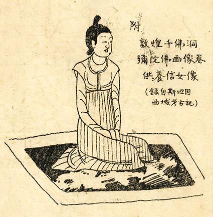 (丙)侍坐供养者像 (一)宁公遇像(第十五图)为年约四十余之中年妇人,面貌丰满,袖手趺坐,一望而知为实写肖像,衣大领衣,内衣领自外领上翻出,衣外罩以如意云头形披肩。腰部束带,由多数“田”字形方块缀成。其衣领与敦煌壁画中供养者像,并最近成都发掘前蜀永陵(王建墓)须弥座上所刻女乐衣饰诸多相似之点,当为当时寻常装束。以敦煌信女像(第十五图附图)与此宁公遇像相较则前者为画,用笔婉美,设色都雅,故信女像停匀皎洁,古丽照人;后者为塑,塑工沉厚,隆杀适宜,故宁公遇状貌神全,生气栩栩,丰韵亦觉高华。唐代艺术洗炼之概,于此二者均得见一斑。惜插图非如照片,精彩之处未易传达。