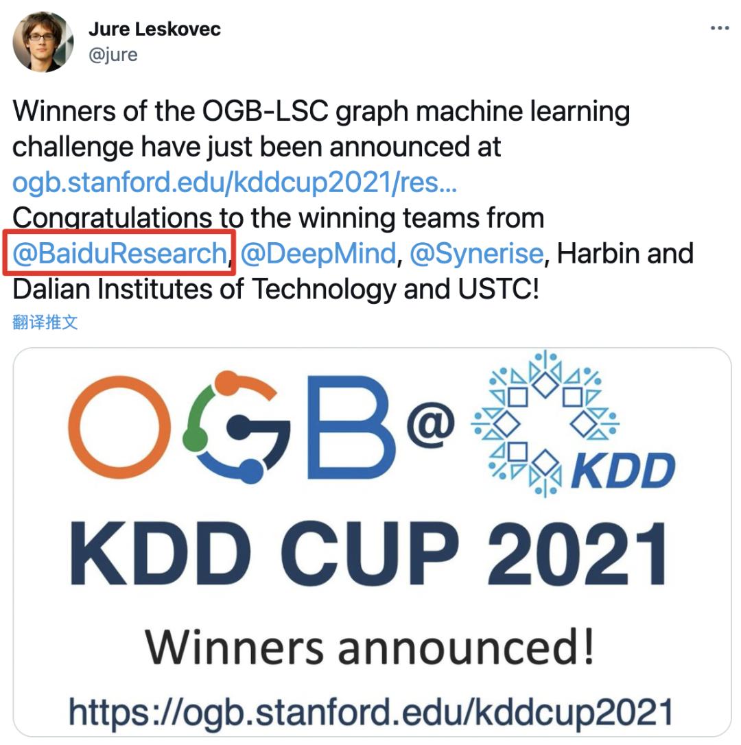 本次大赛承办方斯坦福大学 Jure Leskovec 教授宣布冠军队伍据了解,KDD CUP 是 ACM SIGKDD 组织的年度赛事,素有 「大数据领域世界杯」 之誉,是目前数据挖掘领域最高水平、最具影响力、规模最大的国际顶级赛事。而今年,KDD CUP 与 OGB 联合举办了第一届 OGB-LSC(OGB Large-Scale Challenge)比赛,提供来自真实世界的超大规模图数据,来完成图学习领域的节点分类、边预测和图回归三大任务。