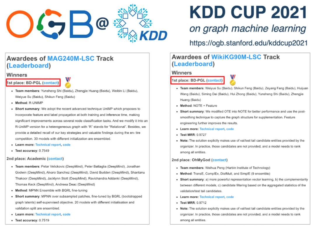 KDD CUP2021首届图神经网络大赛放榜,百度飞桨PGL获得2金1银