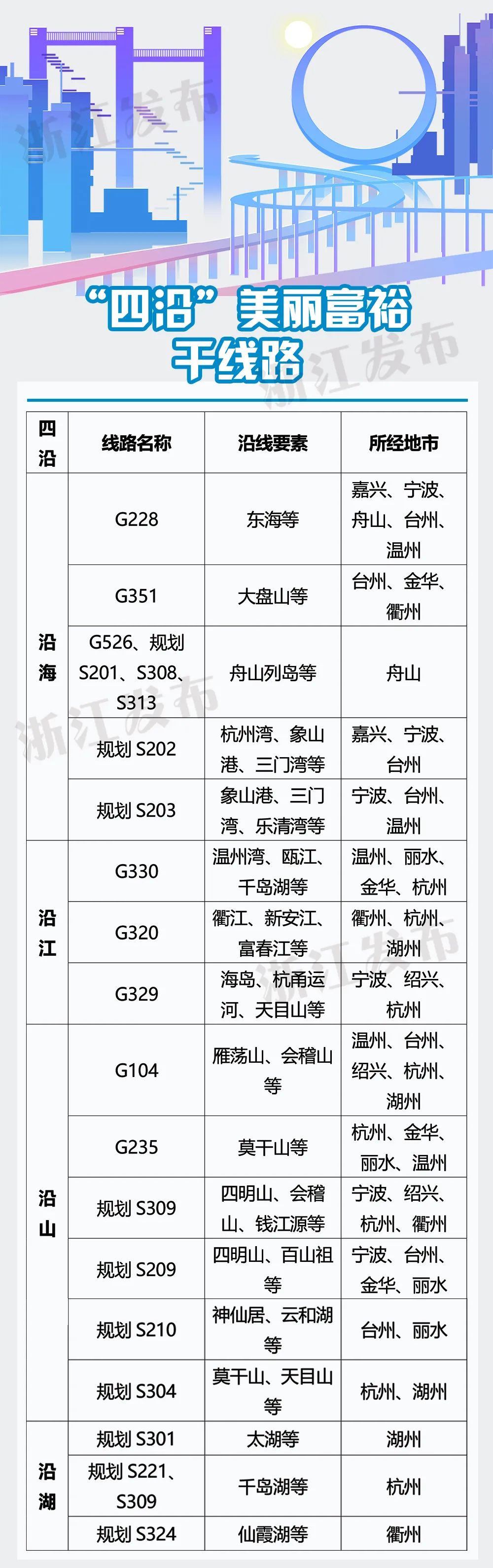 浙江以普通国省道为重点,成条成网建设“畅、安、舒、美、绿”的“四沿”(沿山、沿海、沿江、沿湖)美丽富裕干线路。“十四五”期间,建设美丽富裕干线路约2000公里。