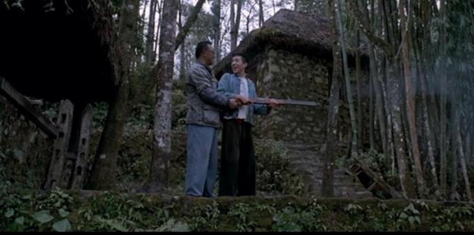 顺着马小军的脉络,非常明显的一点是,李东方仍处于一种“无父”的莫名痛苦中,无论是拿到父亲被剪去头像的照片时的哭泣,接连询问父亲模样时的急迫,还是听说父亲有枪时的惊喜,都显示出其“寻父”的意向与努力。但不同于马小军渴望成长却又难以挣脱父权的青春阵痛,李东方显然已经成熟到足以承担起照顾母亲的责任,当他将疯癫的母亲用竹篓背回家时,瘦小的母亲在他高大身躯的衬托下像是个小孩子,会计、小队长的职务更是确立了他作为一个成年人的主体地位。随后,下放的老唐一定程度上填补了缺失的父亲角色,他教李不空打枪时,两人一前一后的站姿、欣喜地相视一笑,都使这一幕蒙上了些许父子温情的色彩。然而,父权的回归带给李不空的,并非马小军式的主体地位之丧失与成人形象之幻灭,而是进一步的成长乃至弑父。如果说李不空占有唐妻是对作为父亲的老唐的冒犯,那么他对老唐话语的改写——“你老婆肚子根本不像天鹅绒!”——则是对父权的彻底颠覆,通过这一弑父行为,李不空/马小军完成了“无父—寻父—弑父”的成长历程,宣告了自己的男人地位。