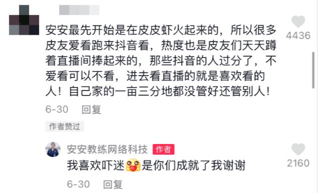 事实上,包括安安教练在内,不少主播早在入驻抖音前,就已经是网红了,其中不乏秀场主播,颇有“秀场主播来抢带货主播饭碗”的架势。其中安安教练是从主打神评论的社区皮皮虾火起来的,她本人在评论区证实了这一点。“居然小蓝蓝”的主播被扒出有近161万粉丝的抖音小号,在火起来之前,她就已经是一个小网红了。