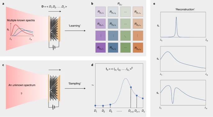 图4:黑磷光谱仪的(a, b)学习、(c, d)采样和(e)重建过程示意图图源:Nature Photonics