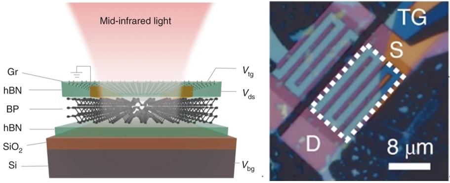 该光谱仪采用了单个可调谐的黑磷(Black phosphorus, BP)光电探测器,其有效面积仅为9×16 µm⊃2;,它可以测量 2 到 9 微米光谱范围内的光,并且是在工作波长范围内构建的。可以调整其黑磷光电探测器中的光-物质相互作用以捕获不同的光谱成分。