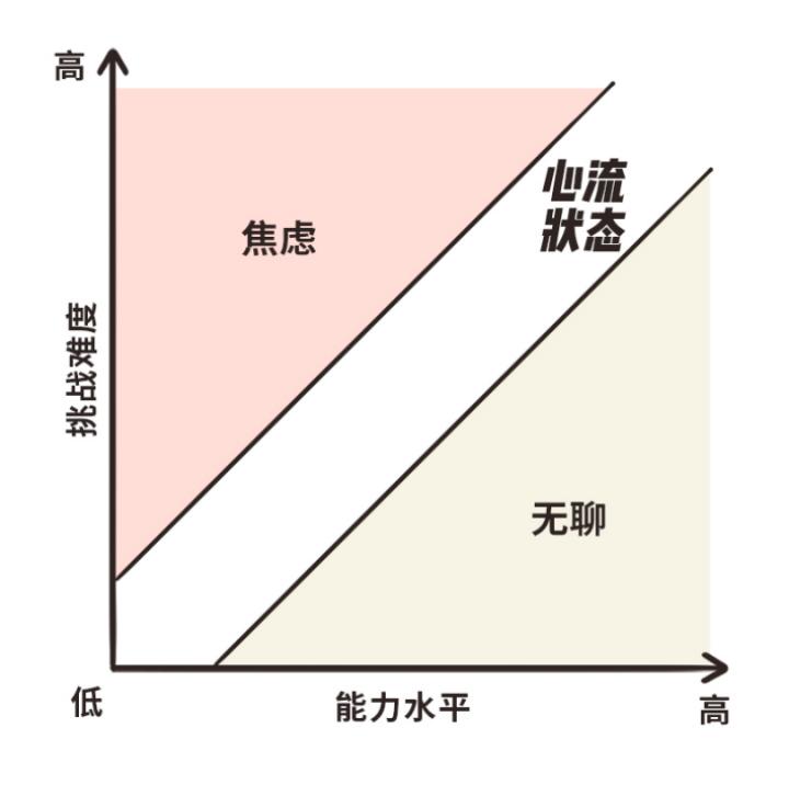 练习心流时平衡技能和挑战是非常重要的,如图所示,挑战难度太大而技能水平太低,容易让我们感到焦虑;难度太低,技能绰绰有余时,又可能让我们觉得无聊。因此,在寻找心流的状态时,我们可能需要不断地有意识地调整挑战的难度以适应自己的技能水平。