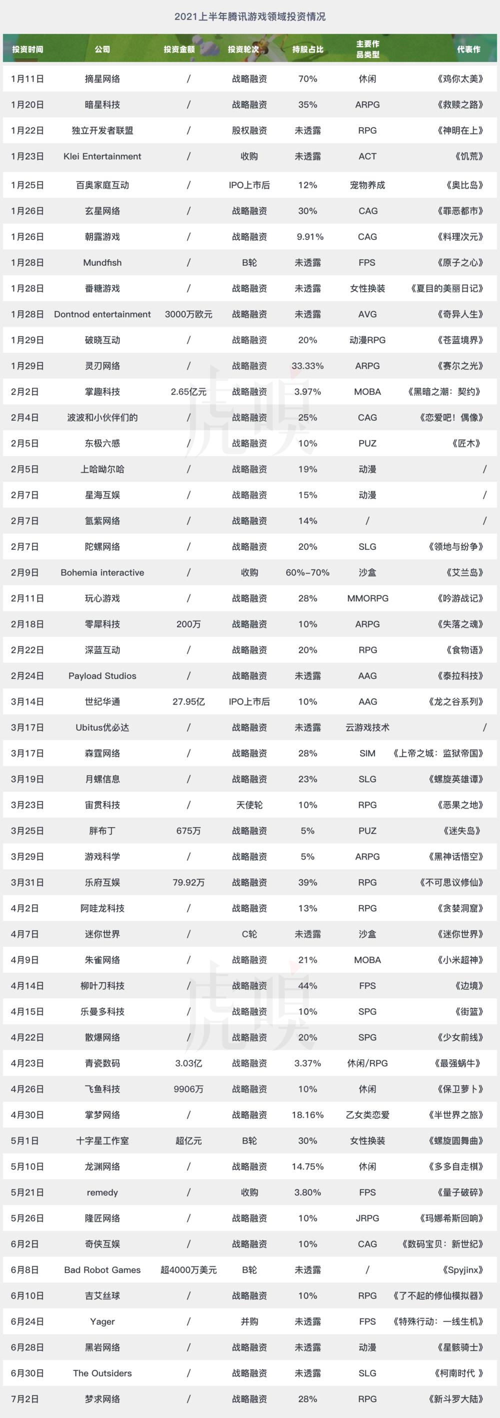虎嗅通过梳理2021上半年以来腾讯在游戏领域的投资新闻发现,截止7月4日腾讯直接或间接投资公司多达52家,远超热搜中统计的27家,平均下来应该是3.5天投资一家游戏公司,其数量和效率都是历年之最。