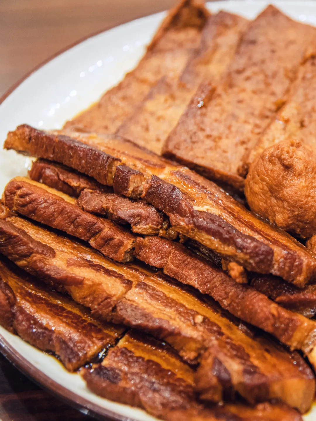 肉皮柔韧,弹牙有劲,却又滑溜爽口,味道纯正,完全保留着油脂的香气却无丝毫油腻。