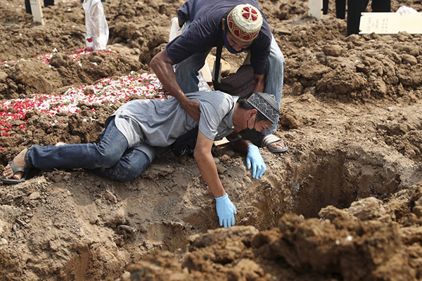 7月7日,在印度尼西亚雅加达一处墓地,一名男子参加因新冠疫情去世亲属的葬礼时倒地痛哭。新华社 图