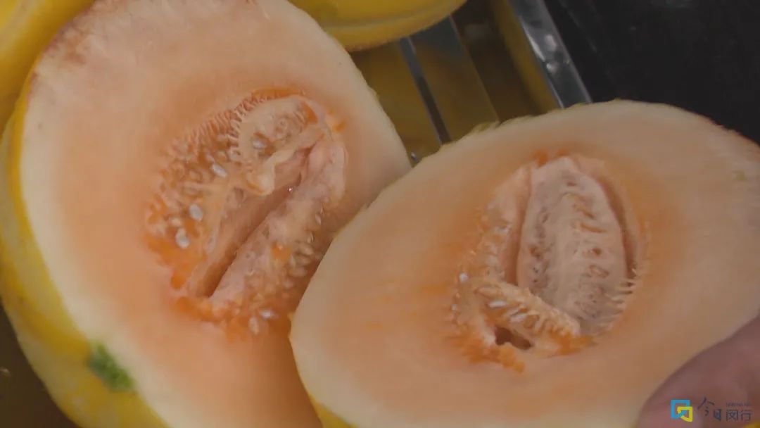在三友种苗种植基地记者看到,已经成熟的金福来哈密瓜正静静地挂在果枝上,果皮呈金黄,像极了七宝黄金瓜,内里可是哈密瓜的果肉,脆甜爽口,甜度达到了17.8%。