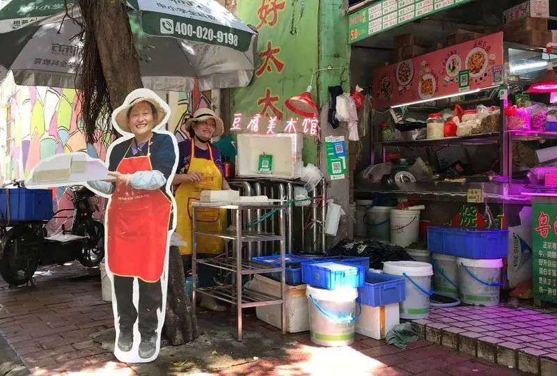 祁红艳的新店铺位置稍偏,最开始摆上一天也鲜有人问津。于是,她把货品摆到马路牙子边上,站在路边向客人推销。何志森发现了,提议她把“豆腐美术馆”的招牌挂出来吸引注意,还额外为她定制了一个人型立牌,吸引来了不少顾客。