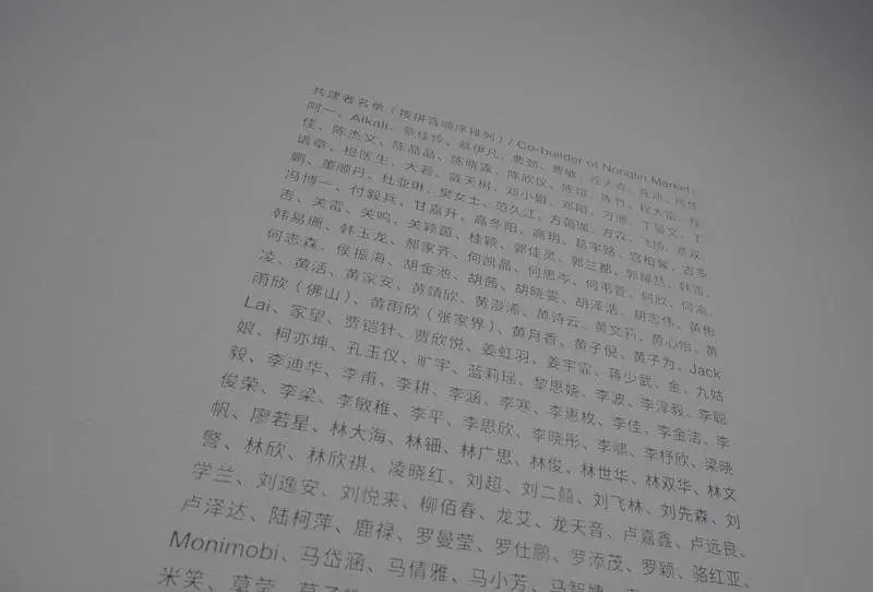 “菜市场”展厅内展示的共建者名单。众筹模式原本缘起于展览经费的紧张,但也让何志森摆脱了“办个人展览”带来的心理负担——他把自己定位为此次重建展览的“发起人”,而非参展者。他认为,真正支持和认同重建的近300位共建者才是“新农林市场”的建造者,他们的存在让这次“重建”不仅是一次“自嗨”的展览,而是一次严肃的见证和声援。