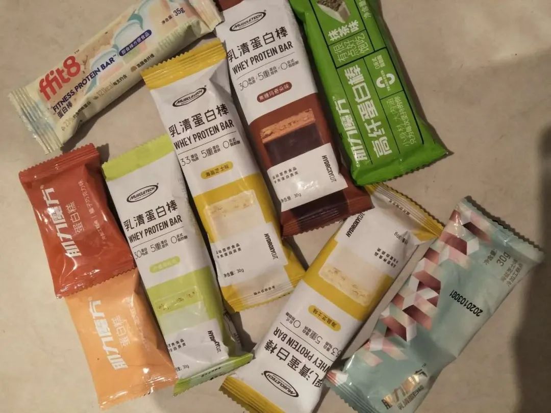 不知道蛋白棒能不能划分为代餐,但对于我,它更像是“代馋”的存在。由于我食量惊人,更恐怖的是喜好各种巧克力零食,所以我买了几个牌子的好多口味蛋白棒:欧力姆几种口味的蛋白粉,蛋白棒品牌是肌肉科技、肌力魔方、fiftt8,因为蛋白棒基本都是巧克力涂层,是我喜欢的零食的类型,有黏黏口感的威化既视感。