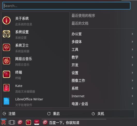 红旗 OS 在使用逻辑上和 Windows 差不多,在屏幕的左下角有一个开始菜单,本身集成了不少常用的系统工具。