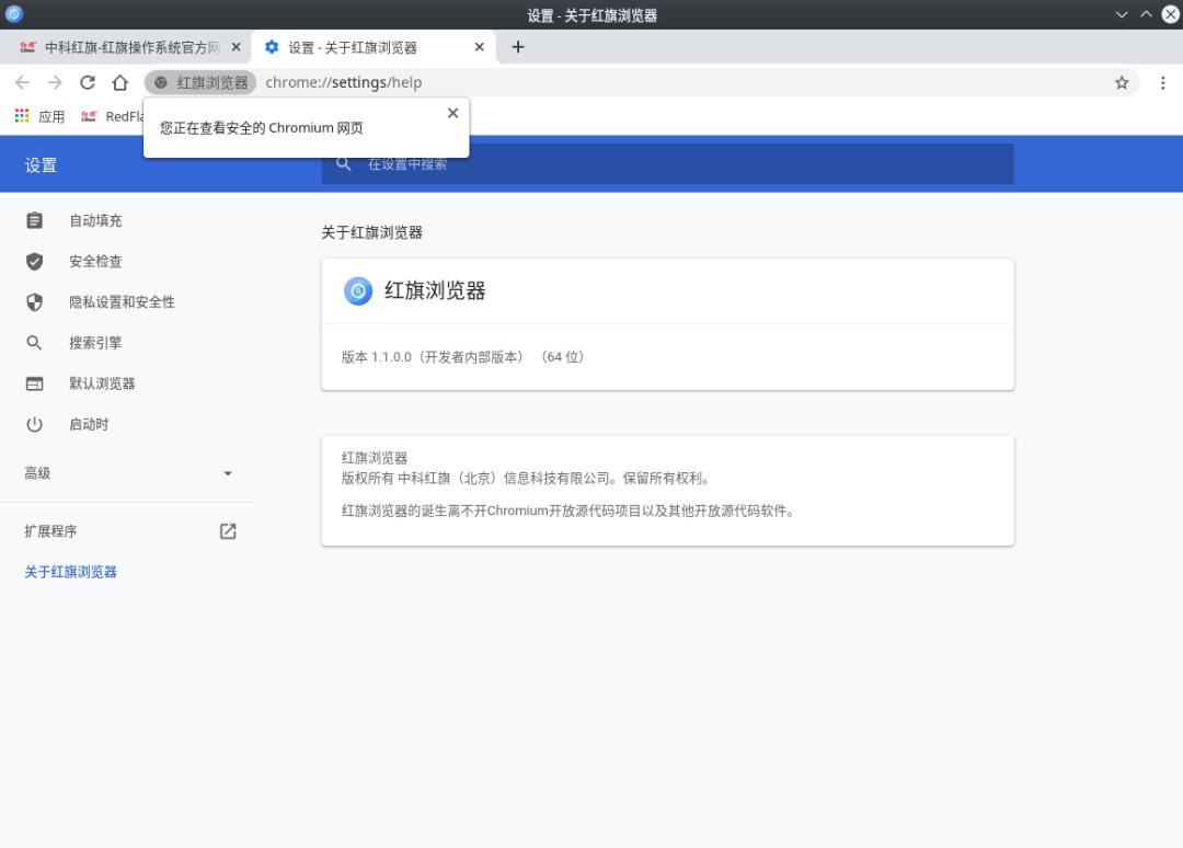 系统浏览器用的是 Chromium 核心的红旗浏览器,谷歌浏览器能干的事儿,它都能干,实用性上没得说,也符合现在主流的浏览器使用习惯。