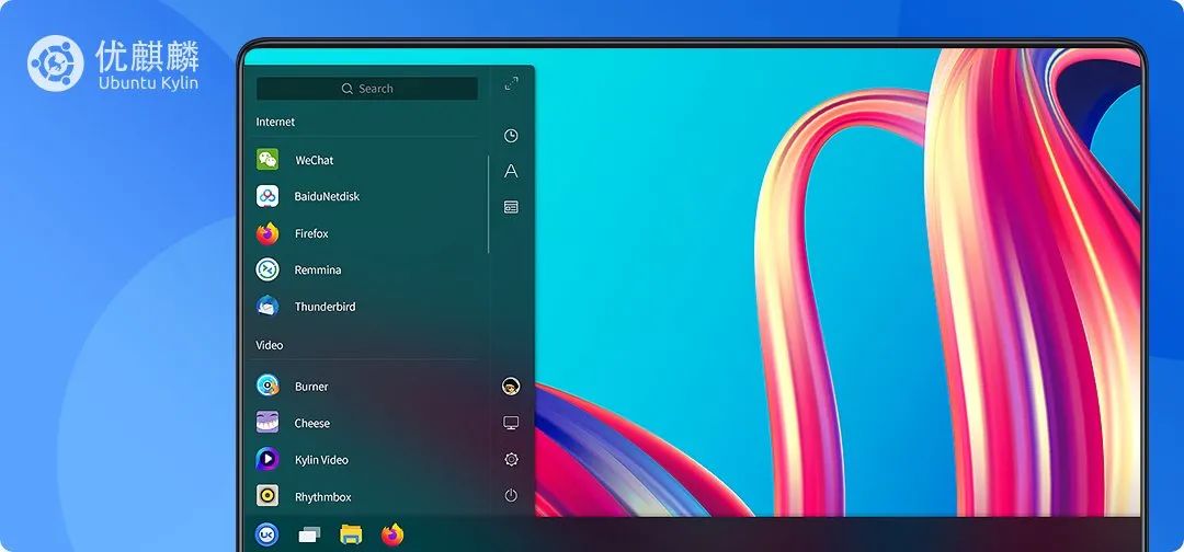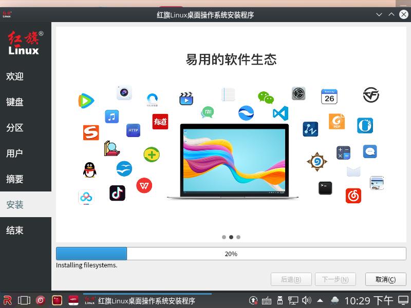 在安装完系统之后,就正式进入到红旗 OS 的系统之中了,系统内置的图标和桌面壁纸,看得出来设计团队花了不少心思。